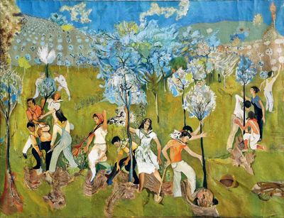 When it was first exhibited in 1972, Edi Hila’s Planting of Trees was praised by his colleagues in the Writers’ and Artists’ Union. However, the playful exuberance of the painting was too heterodox for the communist regime. A year later, Planting of Trees—initially conceived as a metaphor for planting a progressive future for Albania—was denounced for disregarding the principles of Socialist Realism and Albanian Socialism. Hila was sent to a labour camp for three years and Planting of Trees was condemned to be locked in a dark room for nearly half a century.