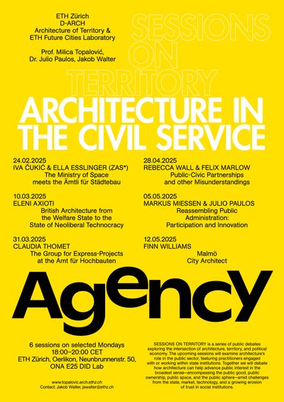 SESSIONS ON TERRITORY is a series of public debates exploring the intersection of architecture, territory, and political economy. The upcoming sessions will examine architecture’s role in the public sector, featuring practitioners engaged with or working within state institutions. Together we will debate how architecture can help advance public interest in the broadest sense—encompassing the public good, public ownership, public space, and the public sphere—amid challenges from the state, market, technology, and a growing erosion of trust in social institutions.