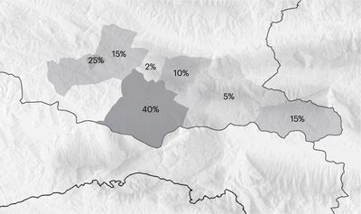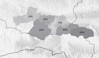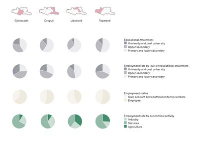 Gjirokastër, Tepelenë and Libohovë are the main villages of the valley, reflected through the highest percentage of employees. Towards the Greek Boundary one finds higher percentages of people relying on remittances/pensions and a high percentage of unoccupied dwellings, mostly seasonally inhabited. In the highland, the percentage of vacant dwellings and pensions are extremely high, in particular for the most remote local governances.