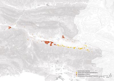 By relating the protagonists of this settlements to one another, we define today’s communities as follows: “employed”, “self-employed”, “students”, “pensioner” and “visitor.” In the Drino Valley today, we recognise four territories: the territory of growth, the territory of decline, the territory of agricultural production and the territory of seasonal inhabitation. Those territories are intrinsically related with the dynamics of the communities. Therefore, we define territories and communities of urbanisation and do believe those have to be rethought by 2050.