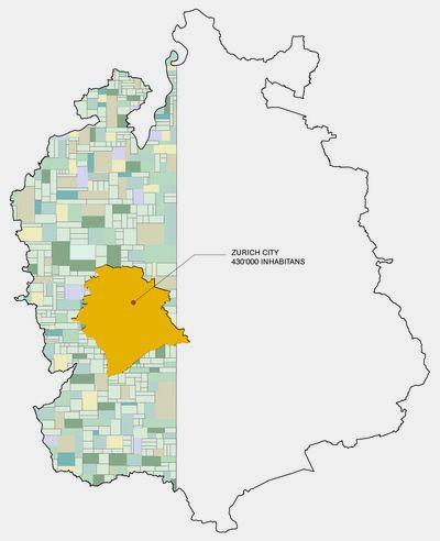 If one transferred his proposal to the City of Zurich, the current inhabitants would live in a total of 804 Bolos and farms in the surrounding area and around 40 % of the area of the Canton of Zurich would have to be agricultural land.