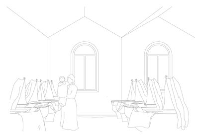 In the courtyard parades and festivities take place. In the left wing there is the large kitchen of the Phalanstère. The children are brought up by the community and introduced to work at an early age. The children live on their own floor and are looked after by educators. The dining room is above and at the top there are the adults’ flats and spaces for visitors of the Phalanges. The centre is for quiet activities (counselling rooms, libraries). In the right wing there are the noisy workshops, the ateliers and the restaurant.