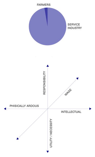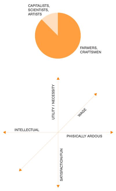 Fourier upholds other values in the wage structure. Laborious and physically demanding work that is considered unpleasant is especially rewarded. Fourier reasons that the least attractive work needs the most incentive. Usefulness to the community is the second important factor. The more pleasant your work is, the less financial incentive is needed. Intellectual work is almost at the bottom of the wage structure and can only be pulled upwards by urgency. Fourier sees in particular farmers and craftsmen as essential for society, therefore seven-eighths of the population should work in these fields.