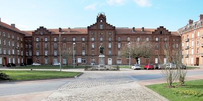 We are standing in the inner courtyard of the Familistère de Guise by Jean-Baptiste Godin (1817–88). Impressively, Godin stands there, as a bronze cast statue, sharing the moment with us. The building with its brick facade reminds us of the buildings of Red Vienna.