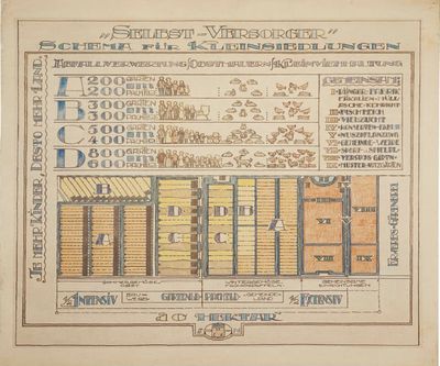 In the book Jedermann Selbstversorger! (1918) Migge describes in detail how the life and gardening on the countryside could look like. He advocates for self-sufficiency regarding food. The garden should therefore have the necessary surface to to meet the family’s nutritional needs. In the book, he makes a precise calculation of the surface needed depending on the size of the household. In addition, Migge proposes a scheme of where what kind of cultivation should take place. For the summer vegetables (Sommergemüse) he proposes a piece of land close to the house, because it is a laborious cultivation which requires intensive care. The winter vegetables are cultivated extensively, this is why they are cultivated on the communal fields outside of the private garden. The communal field is a piece of commonly used land, where every family has a plot whose size depends on the size of the household. Animal farming, for which Migge proposes exact numbers, takes place in the private gardens.
