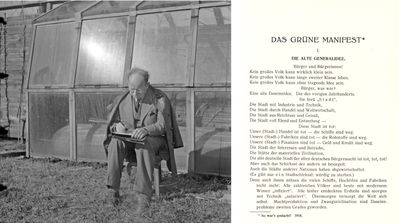 During the revolutionary atmosphere of the abdication of the German Kaiser in 1918, Migge believes that a return to the land, which could drastically improve the living conditions of the German people, is possible, and he writes down his vision as The Green Manifesto. He imagines a land reform, which would allow families to settle in the countryside and overcome the City-Land divide. Each family would own a house with a garden to grow food. According to Migge, returning to the land will solve all the problems of the German population: The productive garden will make families independent of food prices and supplies, the work in the gardens will make them happier and healthier, and the possibility of reusing the waste in composting will make life more hygienic.