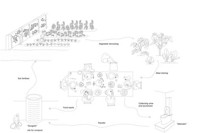 After coming home from work, the family gathers to work in the garden, watering the plants, harvesting vegetables. The son uses the dry toilet, where his excrements are collected. For dinner, the mother prepares a meal with the harvested produce. The organice waste is collected in the Metroklo as well and will later be transported to the dung silo to be used again as fertiliser for the cultivated land.