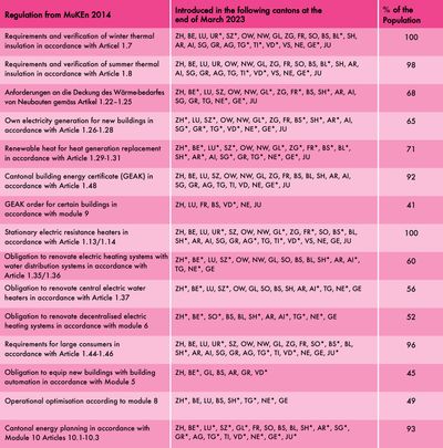 The MuKEn (model regulations of the cantons in the energy sector) is a valuable catalogue of provisions, particularly in the building sector, which focuses on energy efficiency, the promotion of renewable energy and the reduction of CO₂ emissions. Federal legislation states that the regulation of the construction, expansion and renovation of renewable energy plants, the regulation on the mandatory use of solar energy, the regulation of economical and efficient use of energy, the reduction of CO₂ emissions from fossil-fuelled heating systems is left to the cantons amongst other things. Compliance with the regulations from MuKEn 2014 also varies from canton to canton.