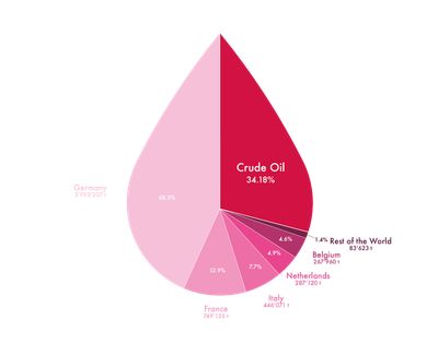 Raffinate products are imported almost exclusively from European countries. Germany provides 68 % followed by France, Italy, the Netherlands and Belgium. These countries import their oil from Eastern Europe, the Middle East, Africa and the North Sea. It arrives by tankers to the ARA region (Amsterdam-Rotterdam-Antwerp). They are afterwards distributed and raffinated in the different European countries and then exported by train, ship, pipeline, or truck to different cities in Switzerland.