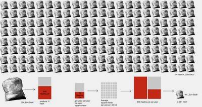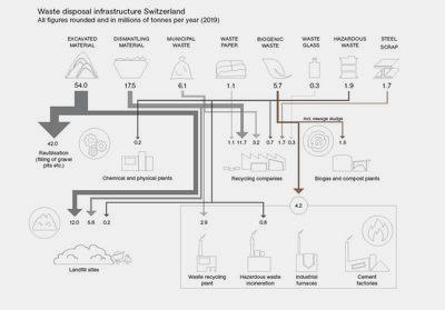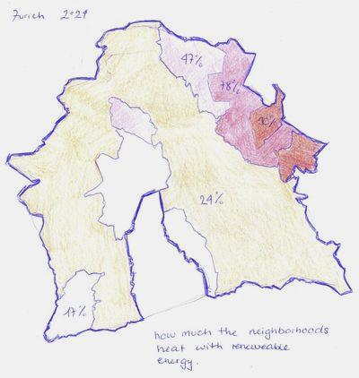The map shows only a fragment of the infrastructures found. In reality, the networks are much more interwoven and denser, such as the sewer network. The invisible structures such as pipes remain underground. By contrast, the visible ones, such as the waste disposal system, are so complex that they are only noticed in passing or only when they no longer function properly. The district heating network marked as black line in the map, represents the main pipes for providing the city with energy.