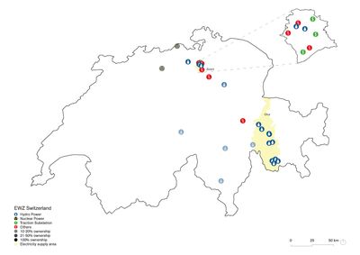 Today, ewz is involved in 28 different power stations in Switzerland. 18 hydro power plants of which 11 are run by themselves, 3 transition sub stations, 2 nuclear power plants, and 5 ernergy, water, and heat networks. 13 of these 28 power plants are located in the canton of Graubünden, where ewz is responsible for 30% of the energy supply, covering the regions of Bergell, Oberhalbstein, Albulatal, Rheinebene Chur, Lenzerheide, and Domleschg.