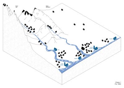 Already before 1850, the potential of water as a power source was recognized. Various industries such as mills, textile production as well as sawmills placed themselves along rivers allowing rural areas to grow, using water wheels to turn energy into mechanical movement such as rotations for millstones or circular saws.