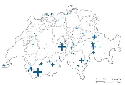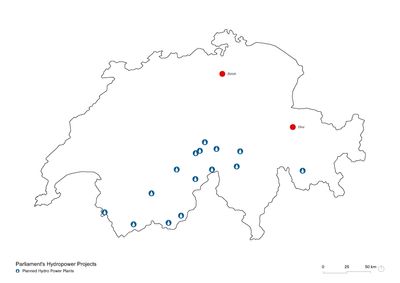 These hydropower plants are located throughout the entirety of Switzerland, creating a hydropower plant belt through the cantons of Wallis, Uri, Glarus and St.Gallen following the alps. As seen on the second map, the hydropower plants with the biggest amount of produced power are located in alpine areas. This is due to the fact that storage hydropower plants, which are mainly located in mountain valleys, produce more power than run-of-river hydropower plants.