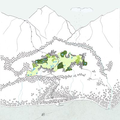 To activate the potential of this exceptional landscape a public park should be formed and connected directly to the historic town of Evian-les-Bains and the mountains. As all of the plateau’s green elements are much influenced by the element of water—may it be directly visible on the surface like the wetlands or hidden many meters in the ground and simply implicit through something like the agriculture—a park to experience and understand the landscape as a part of this special ecosystem seems essential, even more as the question of water will gain in importance in the future. It should be an active part both of the Géopark Chablais as well as the water industry and spa culture located in Evian-les-Bains.