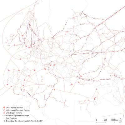 Unlike the global scale of oil markets, the European gas infrastructure is currently a continental interconnected system, with gas flowing from the extraction sites in resource-rich countries such as Russia, Norway or Qatar to our building (Long, 2004). From extraction to consumption, an interruption at a single junction of this interlinked system of pipelines can have major consequences. In order to ensure the flow of gas, the network requires a number of facilities in addition to the pipelines themselves: be it the gas metre in our own building, the so-called city gate, which is responsible for the transfer to the local network, or the compressor stations, which generate a gas pressure of up to 27.5 bar to propel the gas through the transmission pipelines and are arranged approximately 100 kilometres apart. The smaller local lines starting at the city gates and serving the settlements, are working on a much lower pressure.