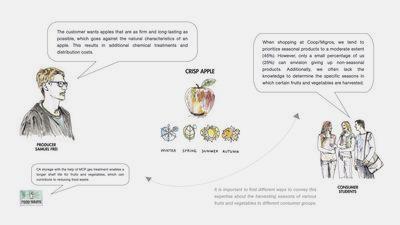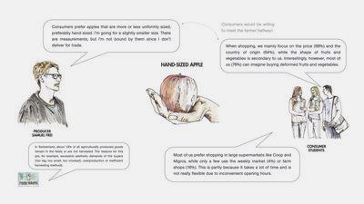 Food waste already starts in the field. 13 % are not harvested or are sorted out because they do not meet the high quality standards of the Swiss market. The consumption behaviour of Zurich residents has a direct impact on the agricultural output in Zurich North. To foster meaningful change, consumers need to rethink their diets and buying habits.The standardisation imposed on vegetables and fruits often results in significant food waste or forces farmers to find alternative uses, such as transforming misshapen apples into cider. Unfortunately, many of these imperfect products are still getting disposed off. Intriguingly, our survey data reveals that 76 % of individuals would be open to purchasing deformed vegetables and fruits. This prompts the question: why persist in current practices when consumer preferences lean towards embracing a more inclusive approach to agricultural produce?
