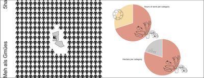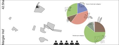 During our research, we were able to classify the different kinds of products and work: crops, fruits and vegetables, wage labour, direct selling, animal farming, viticulture, cooperative work. Through the latter categories we created a catalogue representing: amount of work per category, the amount of area per category and the amount of people working in the farm.
