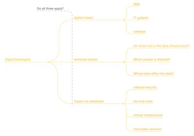 Digital sovereignty is one umbrella term of data sovereignty amongst others. For any topic to enter into the domain of digital sovereignty three areas must be touched: the digital sphere, the territory and the statehood. The term therefore covers digital process operations which have an impact on the territory of Switzerland and its institutions (statehood). Especially, the term statehood foresees that the state as an institution must not be threatened to maintain the states digital sovereignty. If the Swiss government loses data such as the Avalanche Prediction Software, the digital and territorial aspects may be affected. However, Switzerland as an institution is not threatened and therefore its digital sovereignty is also not threatened.