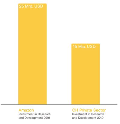 The government has made contracts in the year 2023 with five international cloud providers such as Amazon Web Services (AWS), Microsoft Azure, and others. Making these contracts caused media and political outrage. However, having own data centres would be difficult to implement. On one hand, data quantity fluctuates quickly. It would take up to fifteen years to build a data centre while renting as much space as needed with international providers requires only minutes. On the other hand, it would be unreasonable financially for Switzerland to invest in data centres. Amazon Web Services alone invests 25 billions US dollars in research and development. This sum is ten billions more investment in research and development than the whole Swiss private sector across all domains. The financial divergence is clear. The statistics show the capacity of hyperscalers compared to Switzerlands investment capacity.