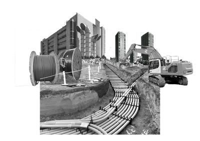 The construction of this network reveals the profound material entanglements of digital infrastructures. Streets are excavated by machinery, while fibres are carefully laid into trenches and covered up by workers. This process of revealing the underlying work emphasises the physicality of the digital. Even if only temporarily, its presence can be traced through excavation sites and the anonymous efforts of technicians and construction workers.