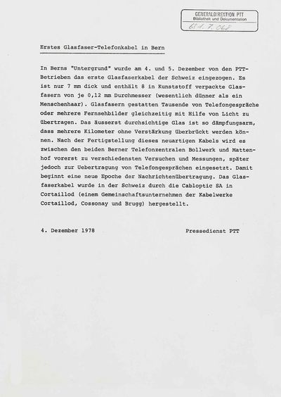 The introduction of fibre optics in the late 1970s marked a new technological era. In December 1978, the PTT (Post, Telephone and Telegraph) proudly announced the installation of the first Swiss fibre optic cable beneath the streets of Bern. The press release, written in the bureaucratic tone typical for a technical milestone, nonetheless conveyed an undertone of collective pride: a “new epoch of communication” was beginning, driven by Swiss innovation, precision, and reliability.