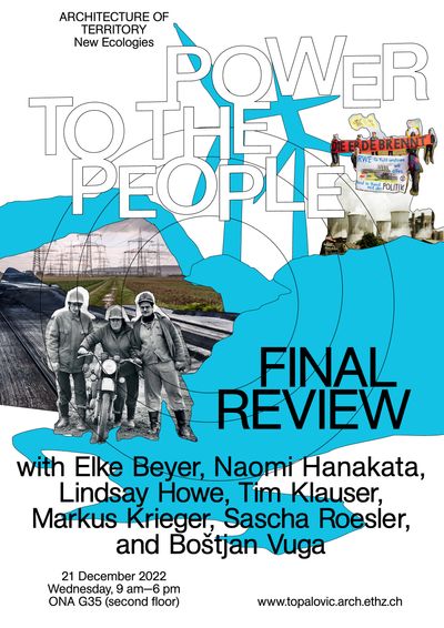 We warmly invite you to join the final review of the research and design studio POWER TO THE PEOPLE: ENERGY AND TERRITORY IN THE RHEINLAND. Our guests will be Elke Beyer, urbanist, Habitat Unit; Naomi Hanakata, architect and researcher, National University of Singapore and HANAKATA; Lindsay Howe, architect and urbanist, Universität Lichtenstein; Tim Klauser, architect and teaching assistant, ETH Zurich; Markus Krieger, architect and editor, ARCH+; Sascha Roesler, architect and architectural theorist, USI Mendrisio; and Boštjan Vuga, architect, SADAR+VUGA.