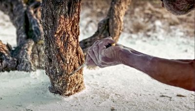 Under the short mastiha tree, they caress the ground: a mother, wrapped in fabrics, and her young son, their bodies bent low as if in prayer or a kowtow. Their hands move in circles around the trunk. Rhythmically, they touch, flatten, and smooth as they spread a white cleansing powder. White fingers, white soil. Arms and twigs bend and twist. Figures fuse in this bodily encounter between humans and a tree. We see the preparation of the ground for mastiha (also called mastic), the aromatic resin of the tree, to fall after its trunk is pierced with cuts from a blade. In this way, the film The Tree We Hurt by Dimos Avdeliodis (1986) captures the mastiha landscapes of Chios in the 1960s as well as its practices of care and harvesting as they still exist and are performed today.