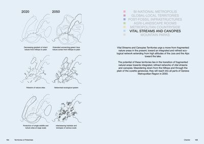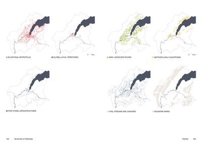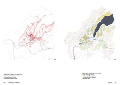 The second axis of the Charter describes seven territories of potentials in the region, that should serve as basis for future land-use decisions. The built-up and the unbuilt lands throughout the region ought to be harmonised with each other, and any further competition among land uses avoided. The reframing of the land use questions tackles specific potentials and problems of Greater Geneva, from regeneration and retrofitting of obsolete fossil infrastructures to the loss of valuable agricultural land to construction, particularly in French Geneva. The seven territories of potentials are: Bi-national metropolis, Global-local territories, Post-fossil infrastructures, Agri-landscape rooms, Metropolitan countryside, Vital streams and canopies, and Mountain parks. Derived from numerous fieldwork expeditions with students in the region since 2016, the territories of potentials have been elaborated through urbanistic and cartographic analysis and synthesis. The Charter also offers a programmatic outline with agendas for design and governance at various scales, and over thirty design case studies for various sites across the region. Thus, a new urban figure, which balances social and environmental needs and qualities, becomes possible.