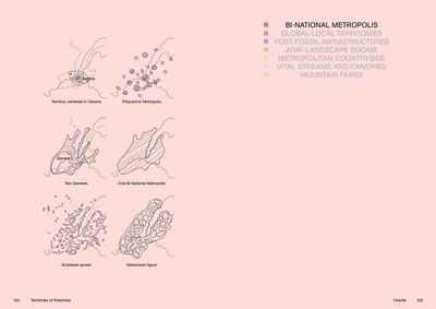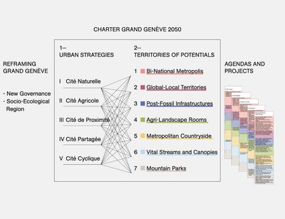 We envision a determined effort toward a new deal for socio-ecological transition based on the overhaul of the current property and governance arrangements on all levels through the idea of commons: from individualism and rentiership in agriculture, real- estate, transport and other urban domains, toward the development and promotion of common and cooperative governance arrangements and models. The prospect for Greater Geneva is organised in the form of a Charter which operates along two axes. The first axis elaborates five sets of urban strategies: Cité naturelle addressing the protection of nature areas and resources; Cité agricole promoting regionalisation of food system on the principles of agroecology; Cité de proximité elaborating strategies for the decentralisation of services and working opportunities across the region; Cité partagée setting precedents for new communal and collective practices; and Cité cyclique setting out approaches to circularity of material and energy flows. These urban strategies can be deployed at various scales, from regional and urban to architectural.
